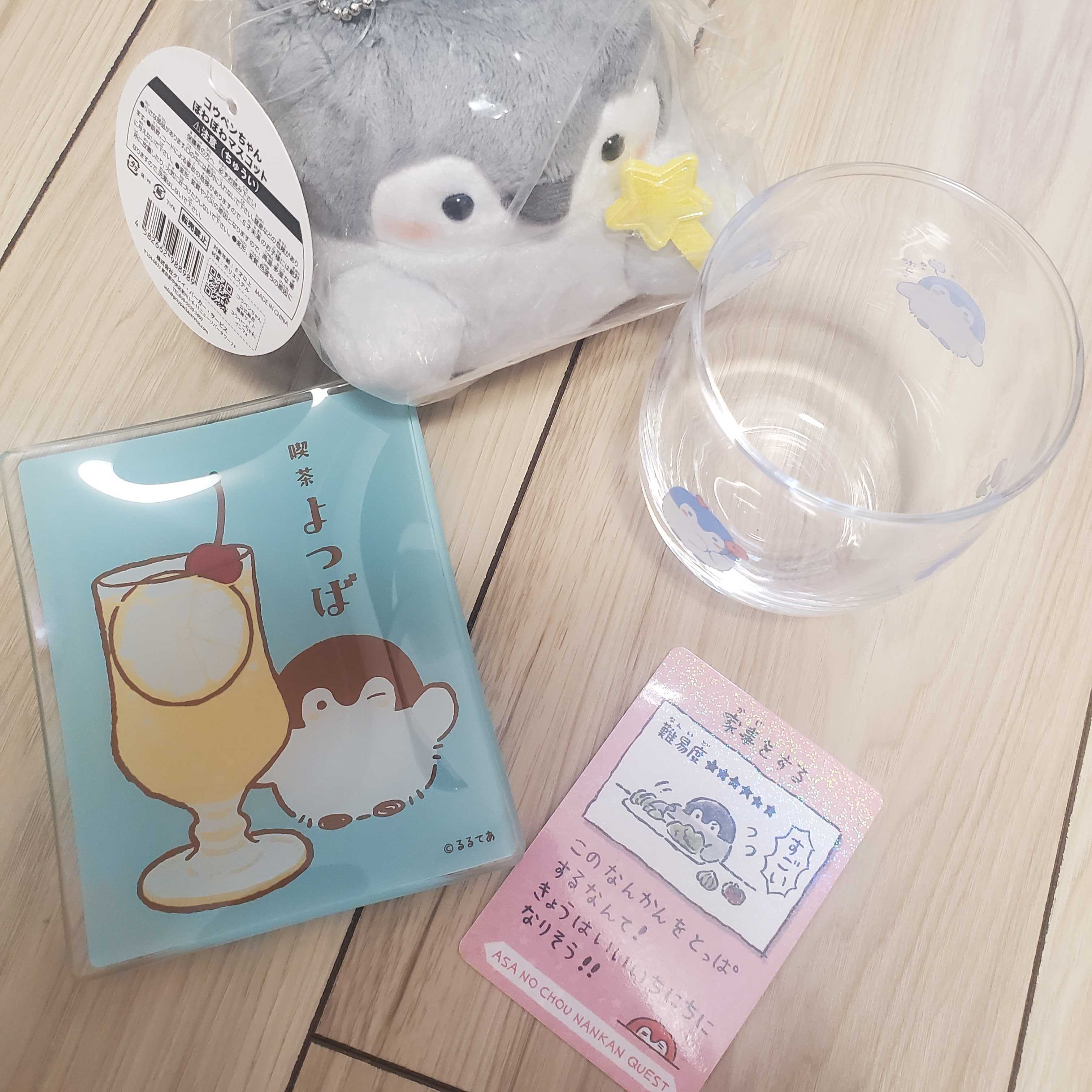 そうすると、今年私からも特に「これがほしい」と言ってなかったのですが、友人がくれたプレゼントをあけるとコウペンちゃんのお皿、コップ、マスカット、朝の超難関クエストカード(笑)とコウペンちゃん祭りでした。