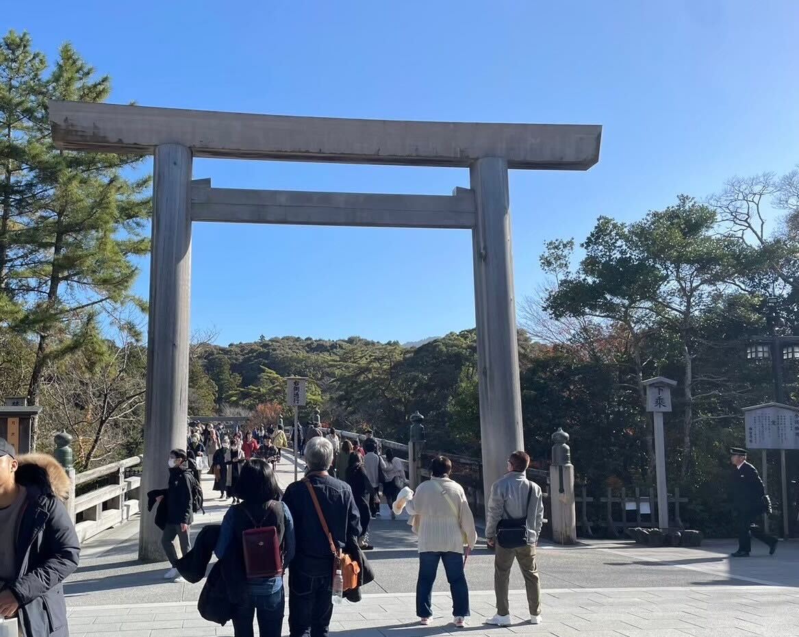 新幹線で大きなおにぎり2つを食べ、腹ごしらえをしながらまずは伊勢神宮に向かいました。