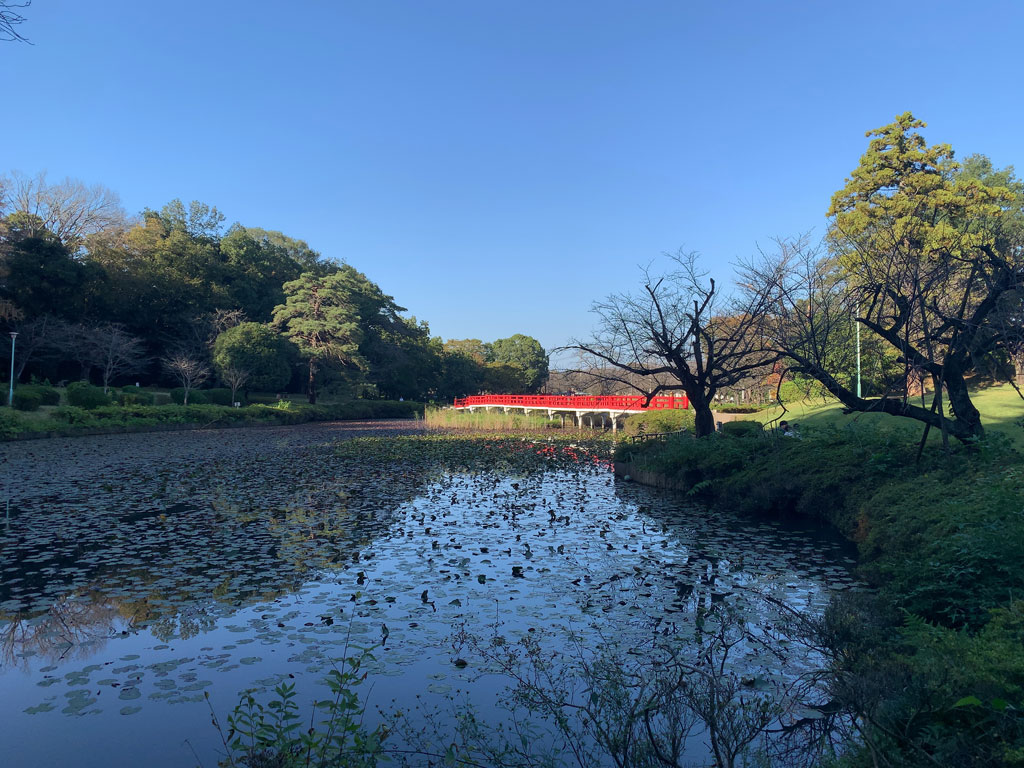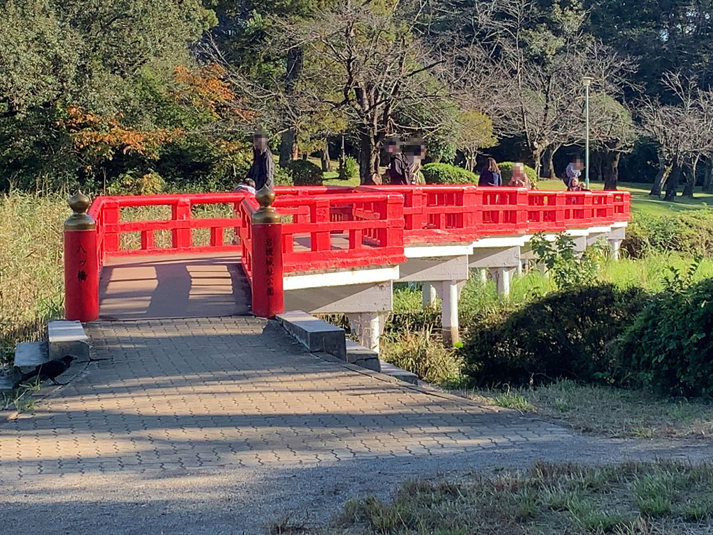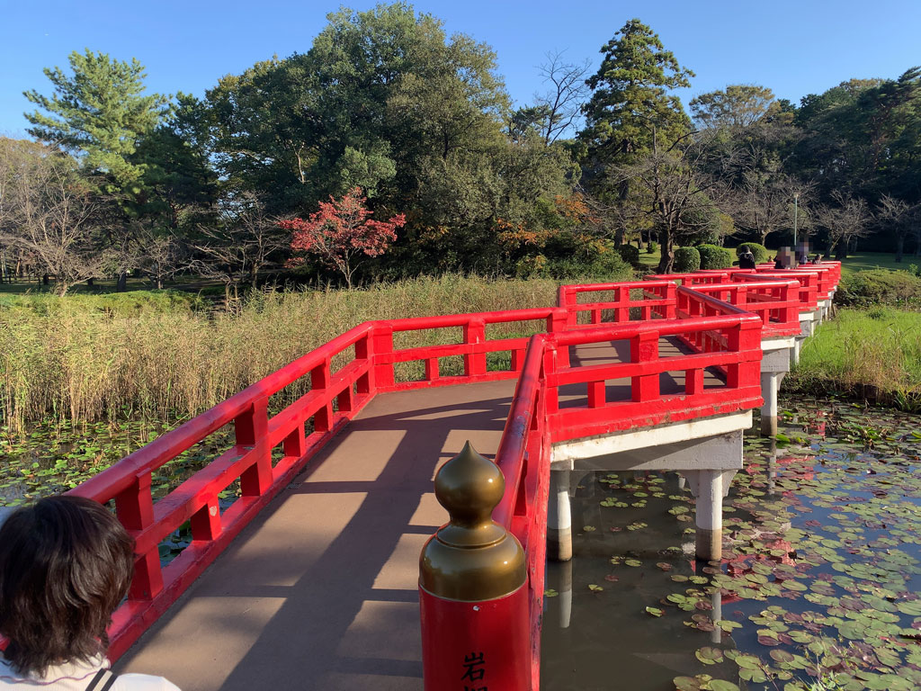 さらに奥へ行くと、蓮池に朱塗りの八ツ橋があり目立ちます。こちらも結構有名です。