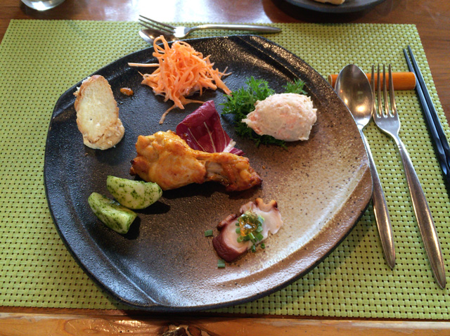 前菜です。中央のチキンはカレー風味で肉がホロっと取れ柔らかかった~