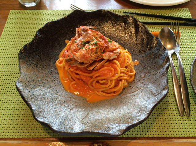 パスタキター!僕が注文したのは「ワタリガニのトマトクリームのキターラ」。パスタにカニとトマトソースが絶妙に絡まって濃厚!