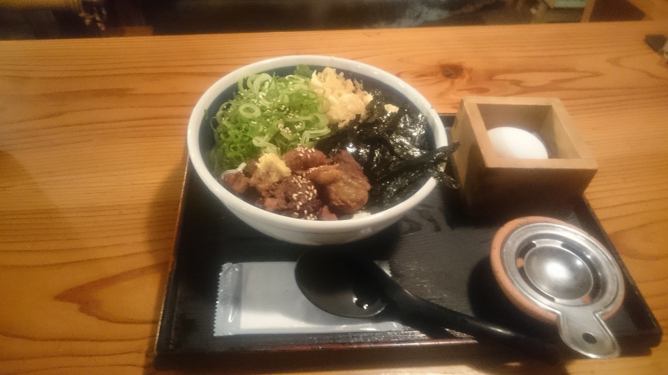 肉厚のすじにねぎ、のり、天かす(メニューによると天ぷらを揚げた際にでる”かす”ではないから天かすではなく”揚げ玉”らしい)が入っており、たまごを入れて食べます。
