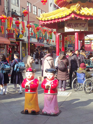 自社への道すがらに立ち寄った南京町でもお祝いの赤提灯が鮮やかです。