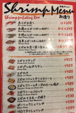 とにかくメニューが海老尽くし‼︎ 裏と表いっぱいにお品書きが。