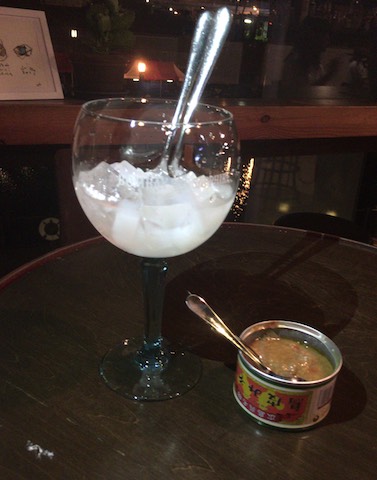 ツマミの鶏皮みそ缶と、何故かナタデココ。・・・何故?