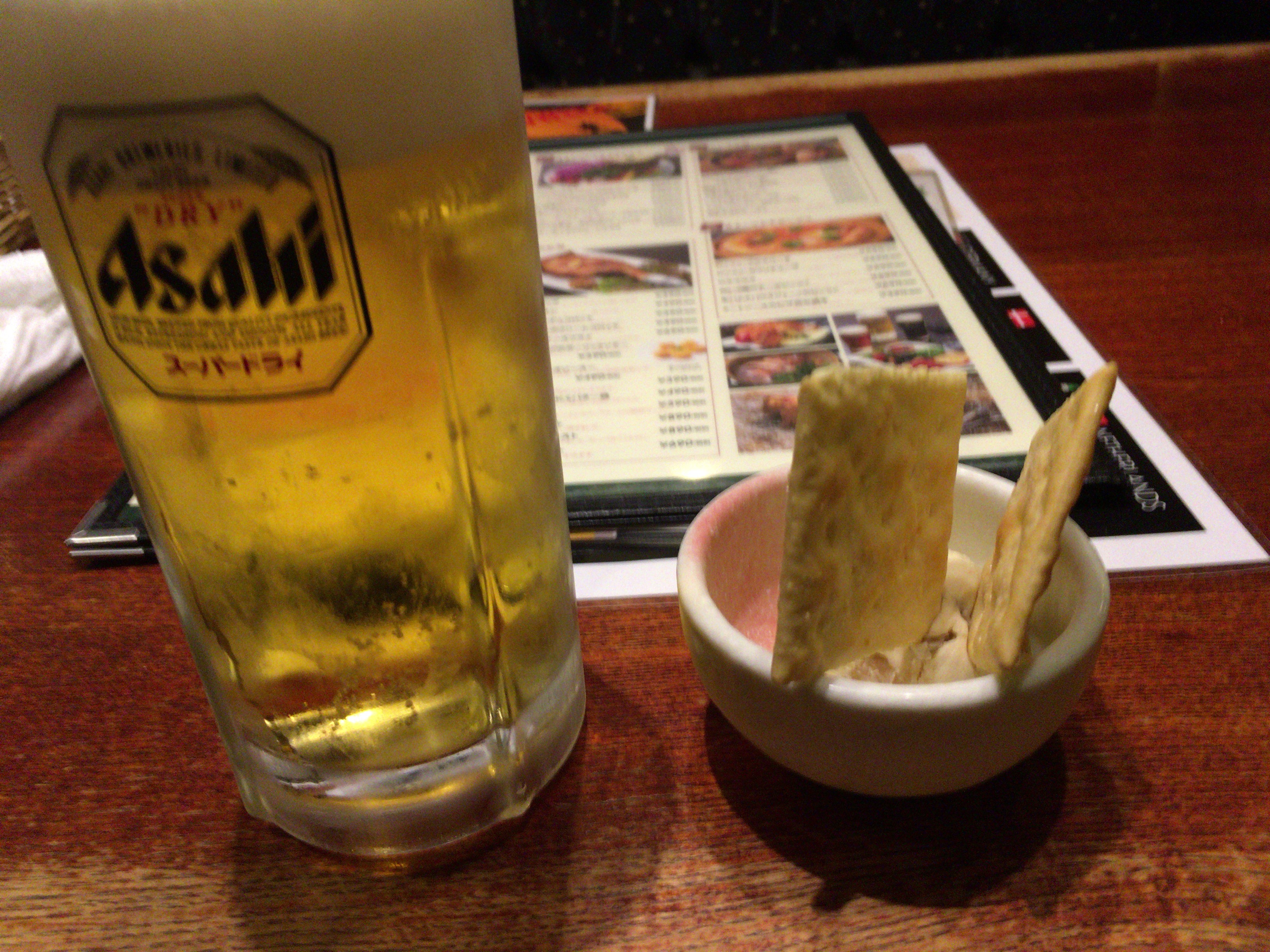 つきだしはクラッカーと、クリームチーズにくるみ?のようなものが入ったものでした。
