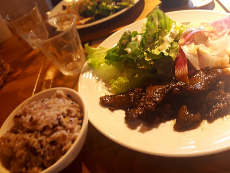 また、店内では好きなときにご飯が食べられます。写真はリブステーキです。おふろカフェはご飯も美味しいことで有名ですが、噂にたがわぬ美味しさでした。ちなみに、頼まなくてもご飯も大盛りです。幸せです。