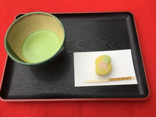 写真はここで飲めるお抹茶とお茶請けの上生菓子です。