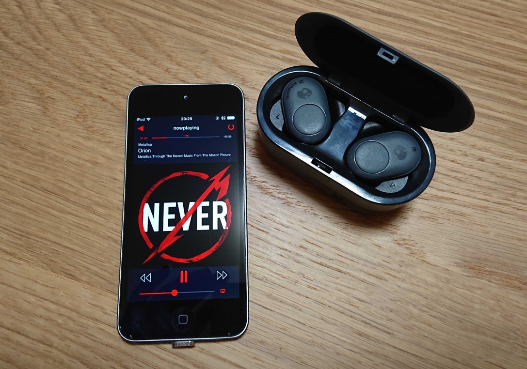 トゥルーワイヤレスのSkullcandy Pushを装着。