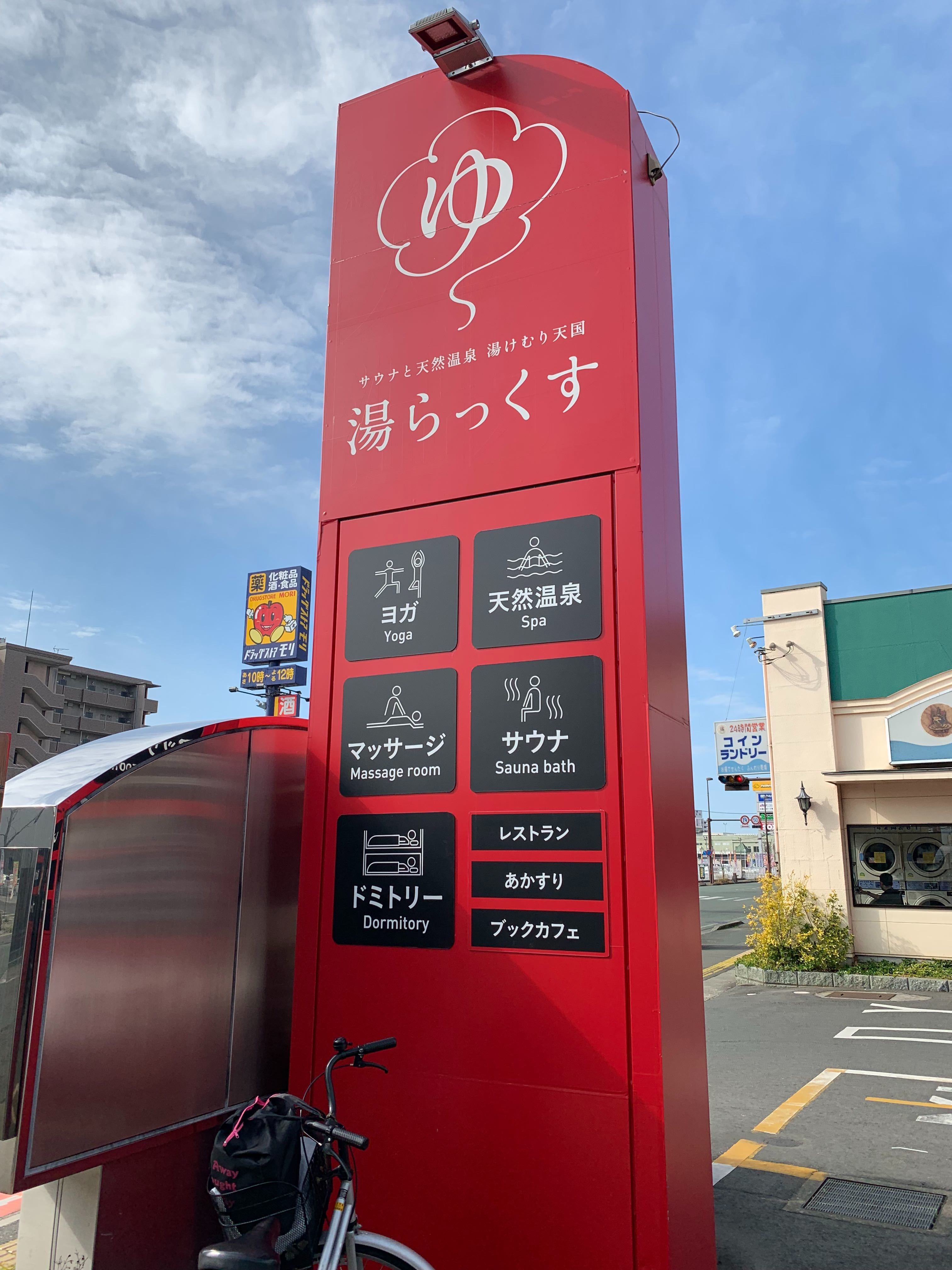 空港からバスに乗って、目的地「湯らっくす」へ。入館料は大人590円!!安いぞ!!