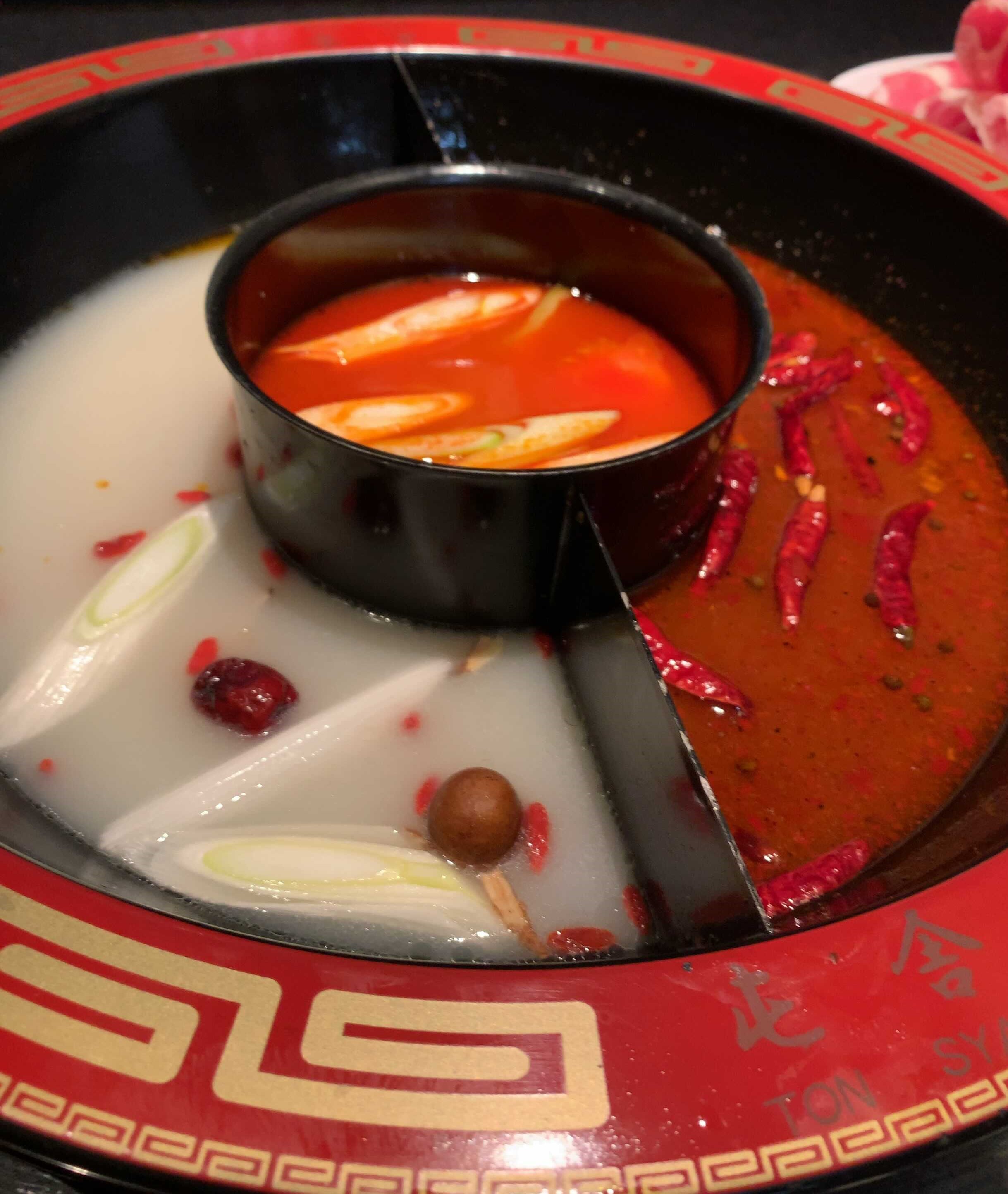 一般的にはその片方にはあまり辛くない白湯(パイタン)スープ、そしてもう片方に唐辛子や山椒がたっぷり入った辛い麻辣(マーラー)スープが入っており、鍋の見た目としては紅白の陰陽マークのようになるようです。