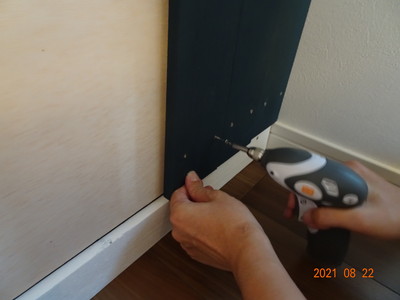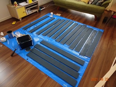 最後に、色を塗った木材を先ほどのベニヤ板に1枚1枚ネジで固定していきます。