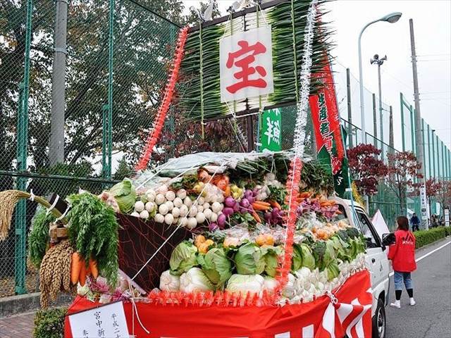 農業祭の方では農作物を船にたくさん乗せて神輿と一緒に練り歩きます。