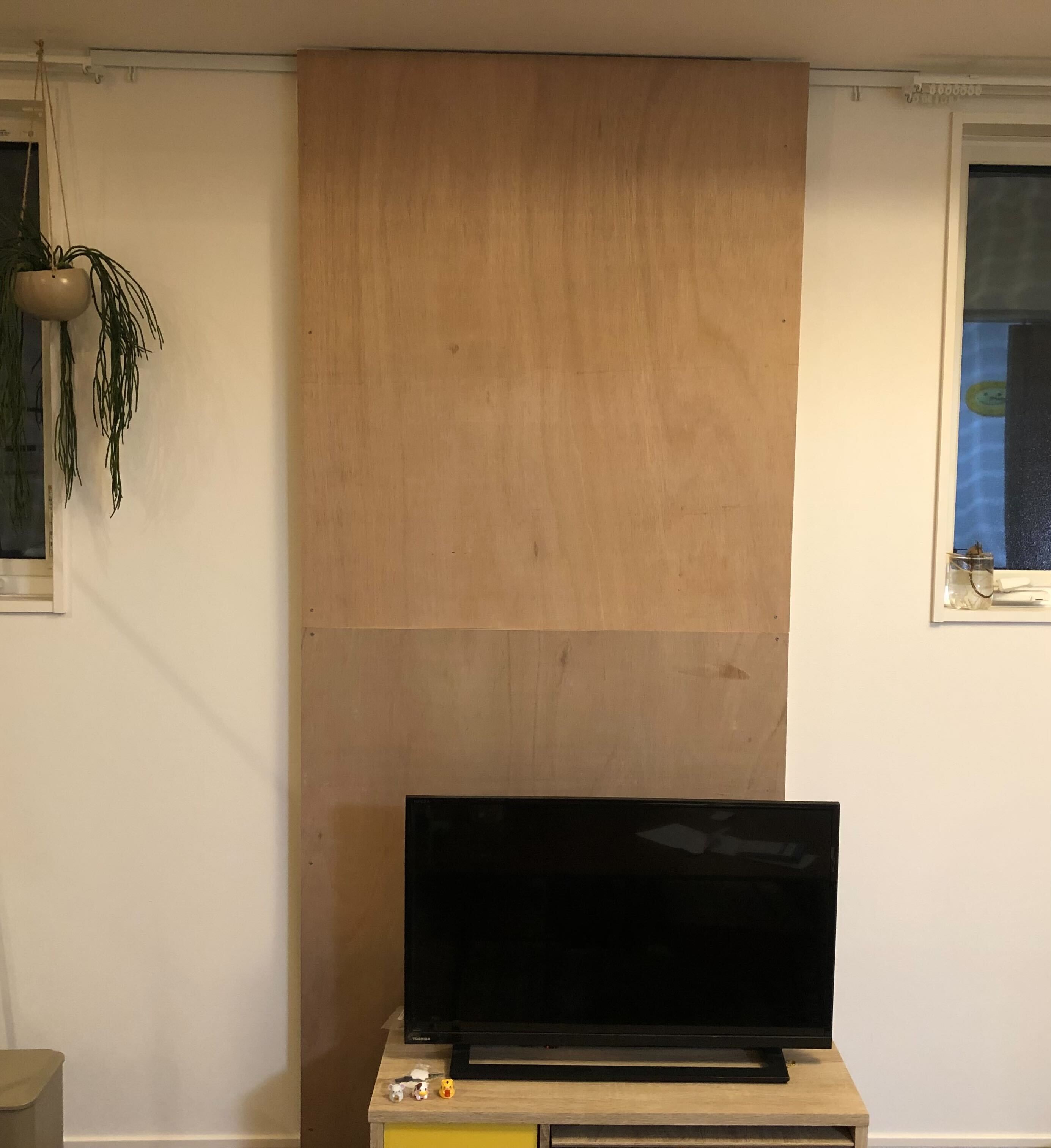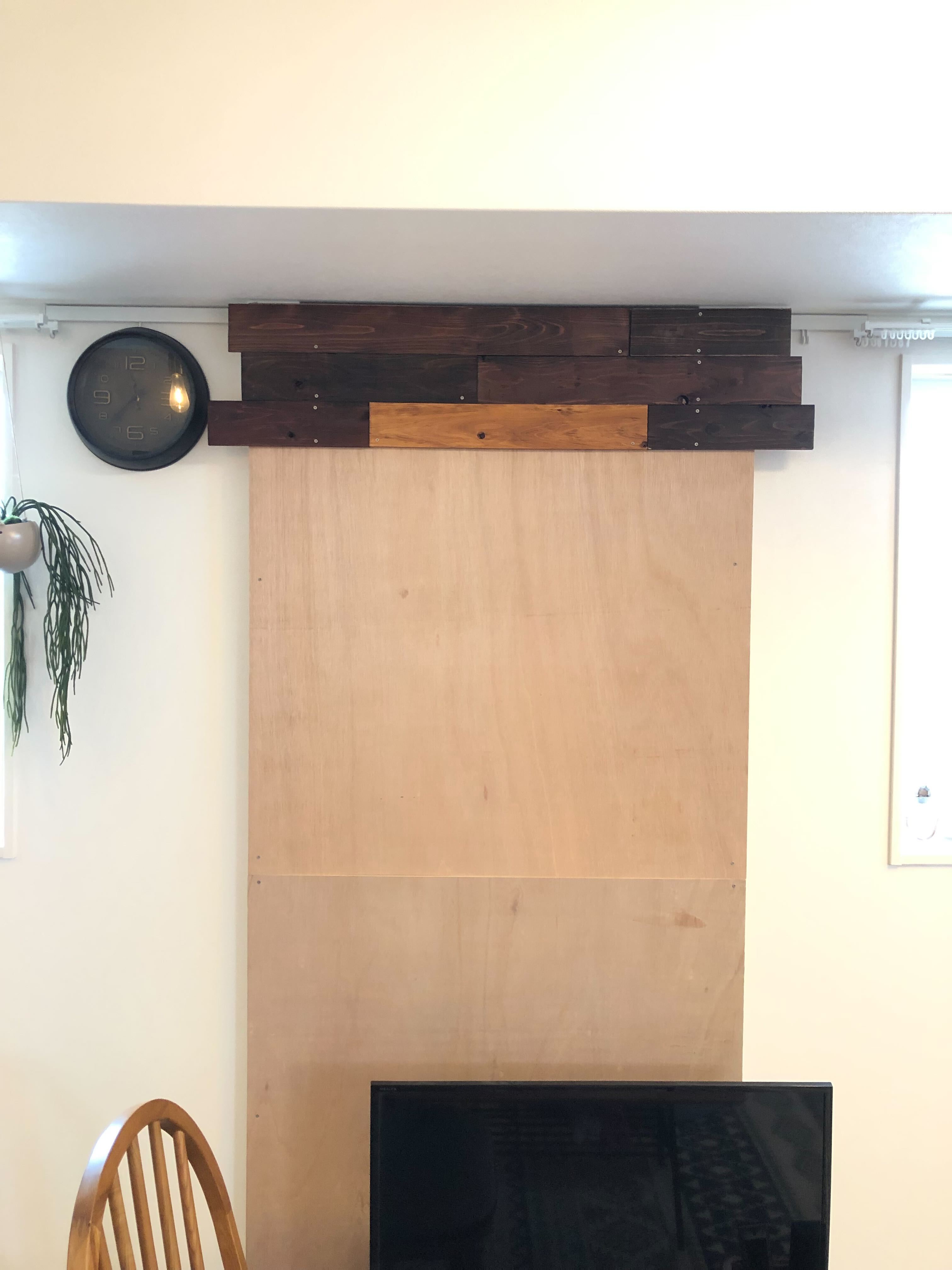 まずは前回同様、2×4の木材をラブリコで突っ張りその木材にベニヤ板をネジで固定します。