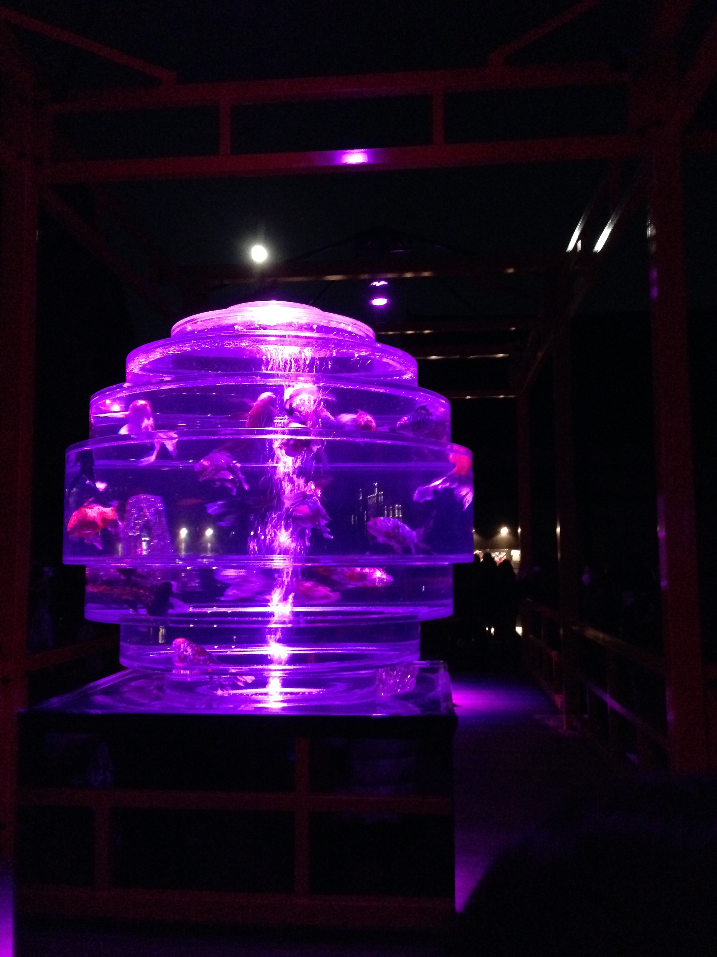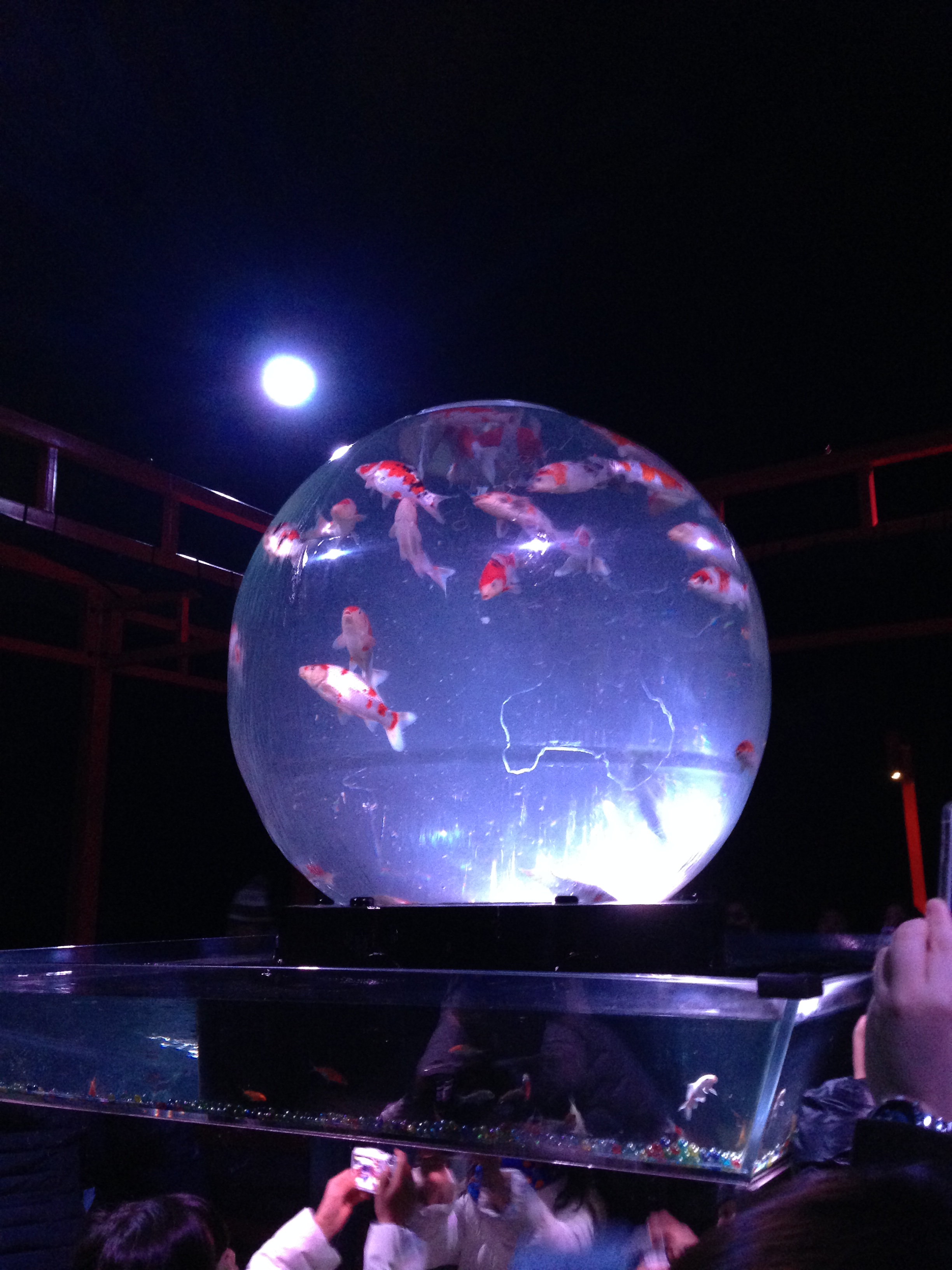 金魚 2014年12月14日2014年12月14日 feissportmoniki 先日 京都に行ってきました。 極寒の中、夜の京都で金魚を見てきました。 「アートアクアリウム in 二条城」 夕方から極寒の中 長蛇の列に並びました。 冬山より寒いんじゃないかと思うくらいです。 中には何匹いるんだ?!というくらいの金魚たち。 イルミネーションとのコラボレーションでとっても綺麗♪ プロジェクトマッピングも。 金魚にこんなに種類があったのか!とか 鯉じゃないのか?!というサイズの金魚もあることに驚いたり。 寒かったけど 楽しかったです!