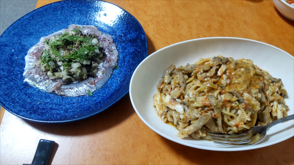 ヤガラのトマトクリームパスタとカマスのカルパッチョ