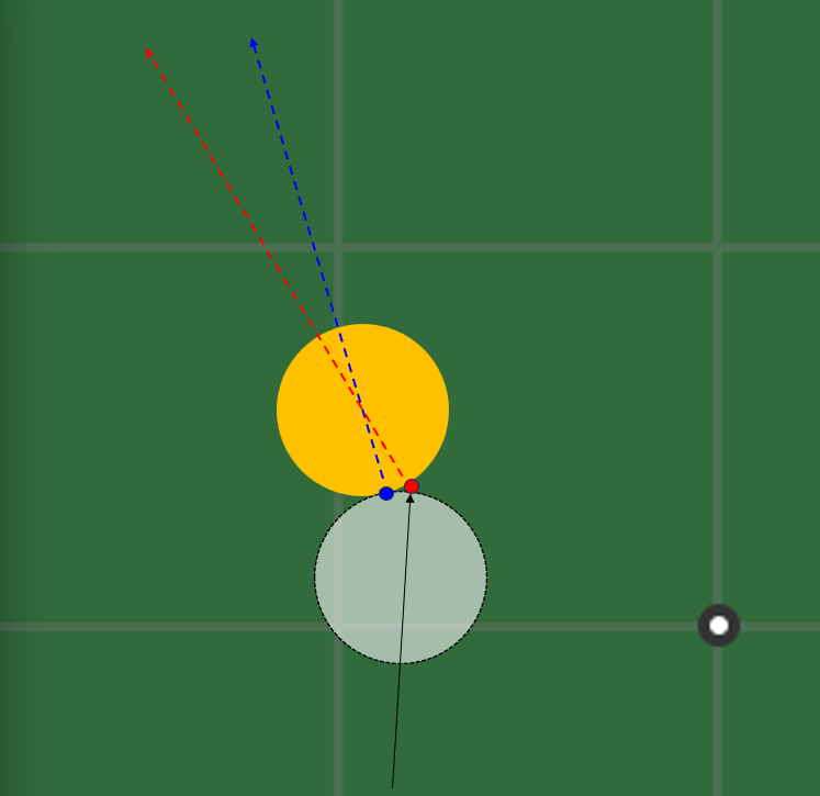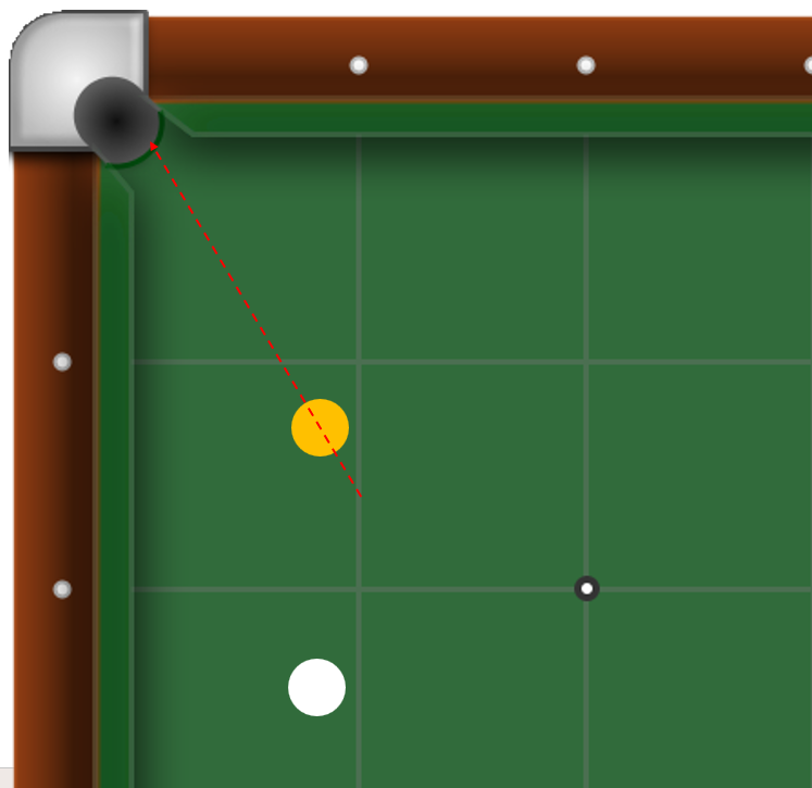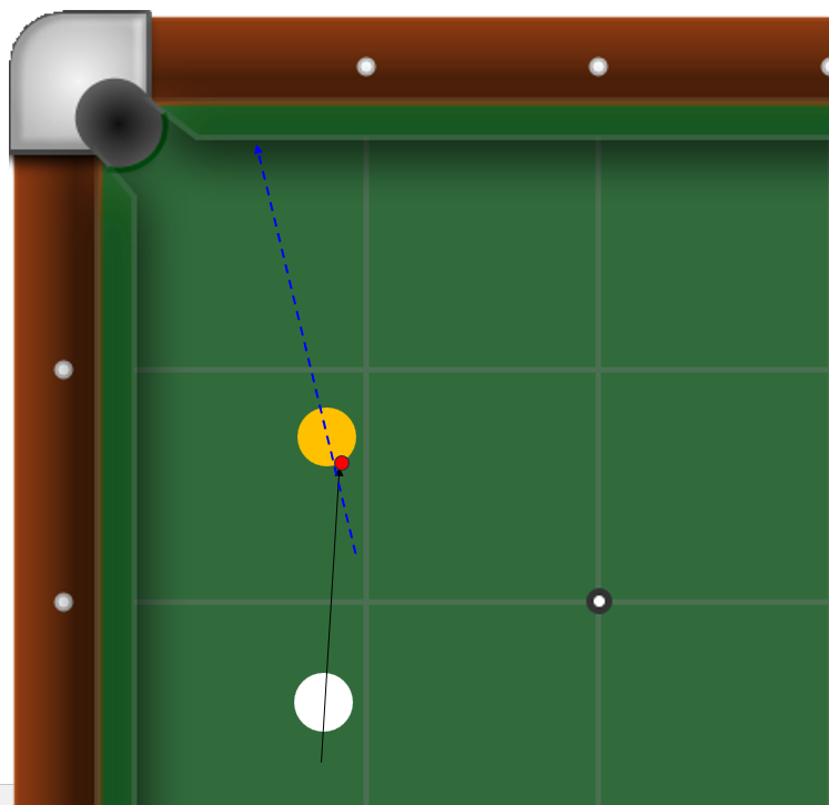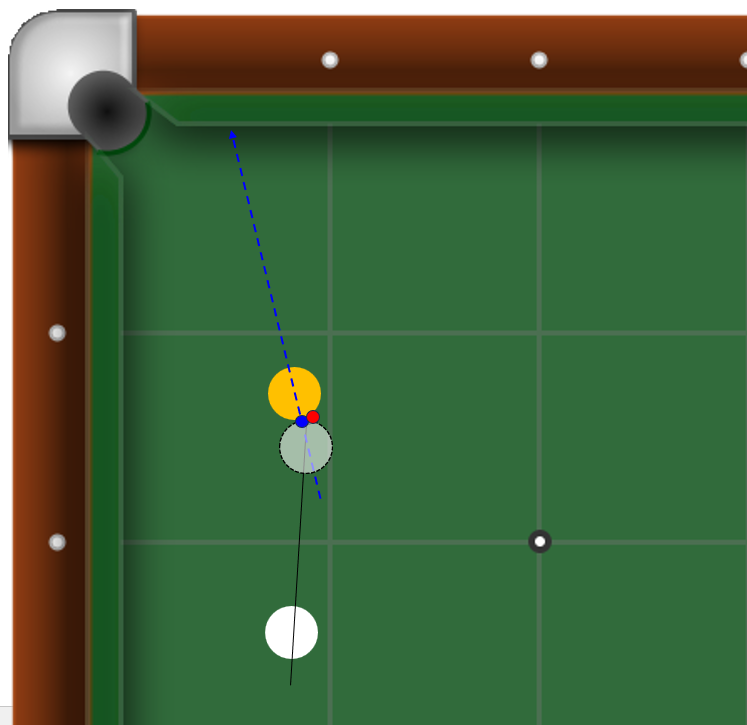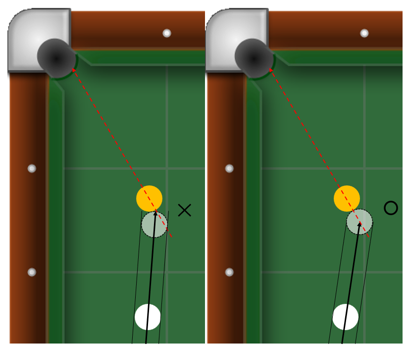 正しく狙うためには、右の図のように、イメージしたゴーストボールと同じ場所に球を転がすとポケットします。